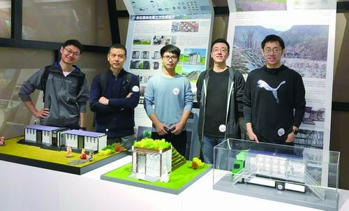 ▲刘新(左二)、梁骥(左一)与生态厕所设计团队成员。