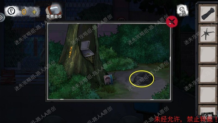 回到校门,点右侧树木,用铁锹挖出残缺的抓钩枪。