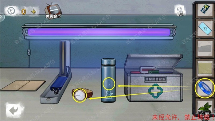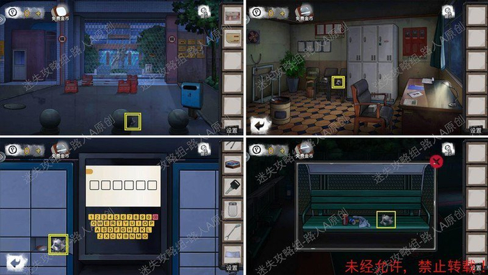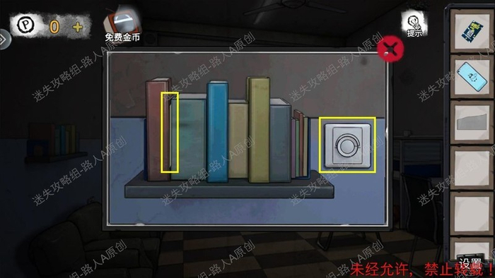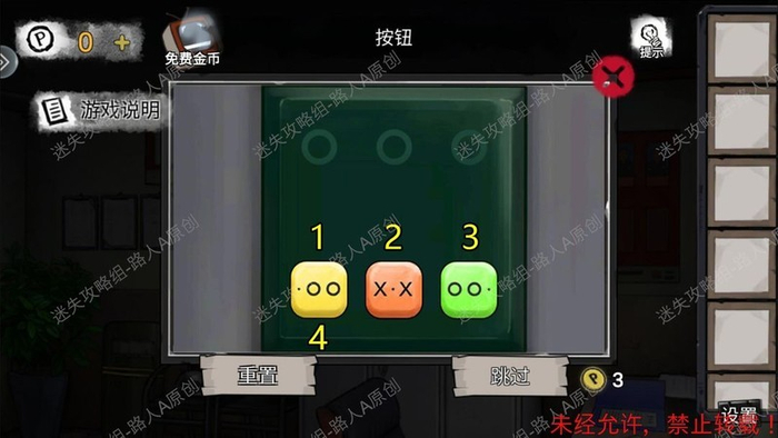 打开柜子,将两个按钮装入门锁,按黄、橙、绿、黄顺序点击,解锁后取得钥匙。