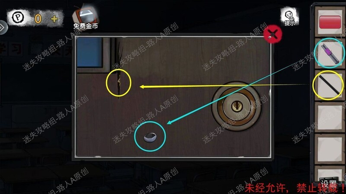 点击左侧靠窗课桌,用图钉割开胶带,将金属片嵌入盒中凹槽,取出获得的按钮。
