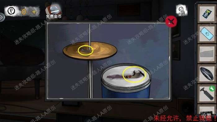 点击架子鼓,先用折叠刀割破鼓面取出布偶,再用六角螺丝刀卸下踩镲螺丝,获取气针。