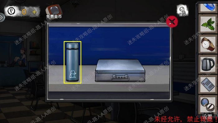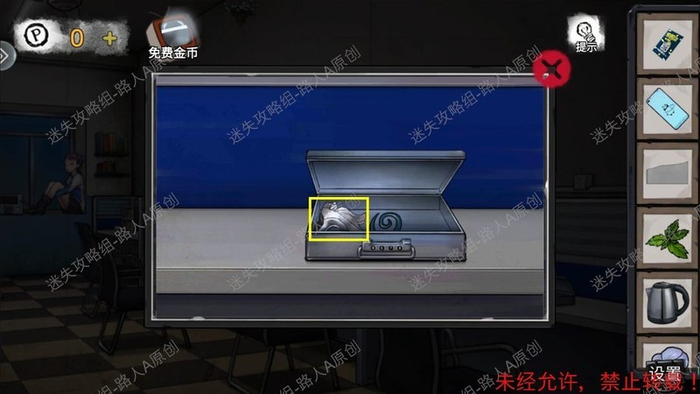 返回办公室,将场景翻转至天花板,点击桌子并在盒中输入密码,获取。