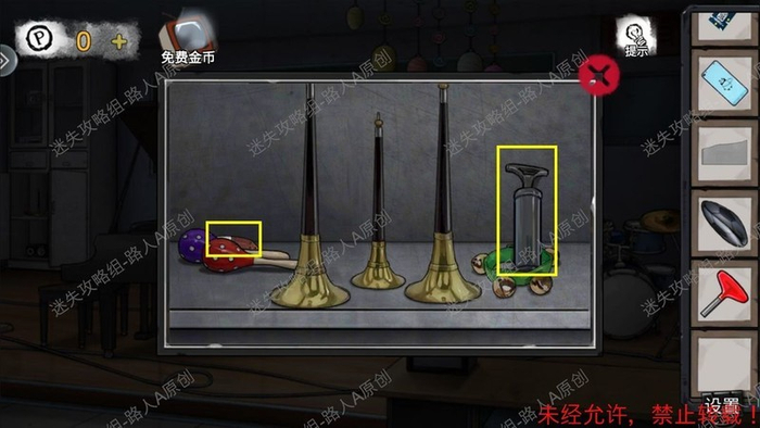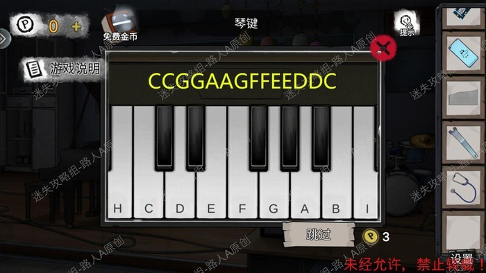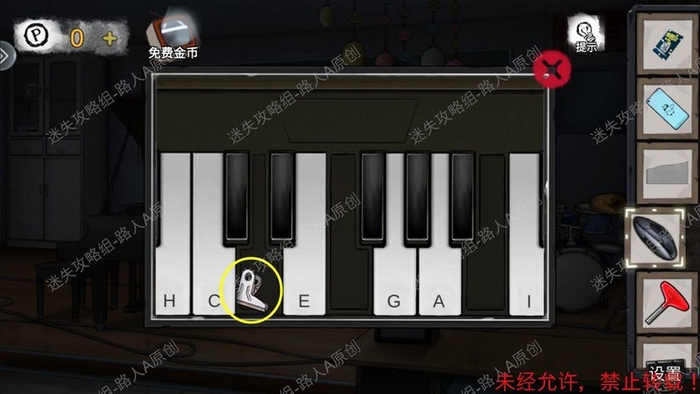 回到音乐室,翻转视角至地板,点击钢琴并装入三个琴键。