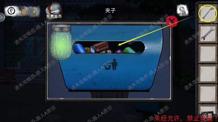 回到校门,点击垃圾桶,用萤火虫罐照明,再用夹子取出扳手。