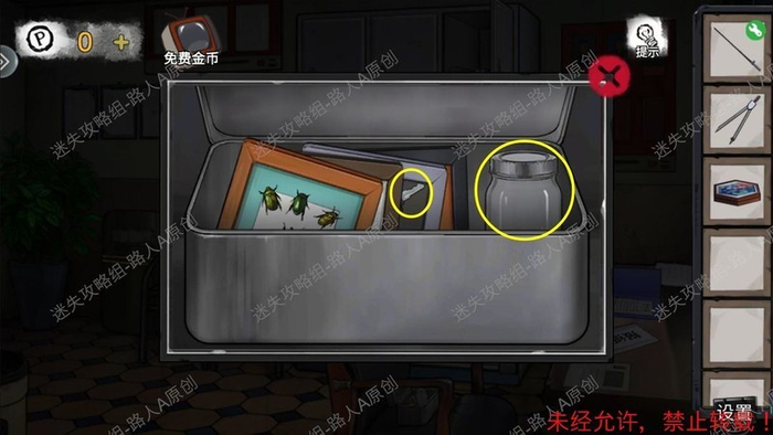 点击教学楼右侧的冰柜,用钥匙打开柜门,使用吹风机融化冰霜,取出旋钮和鱼钩。