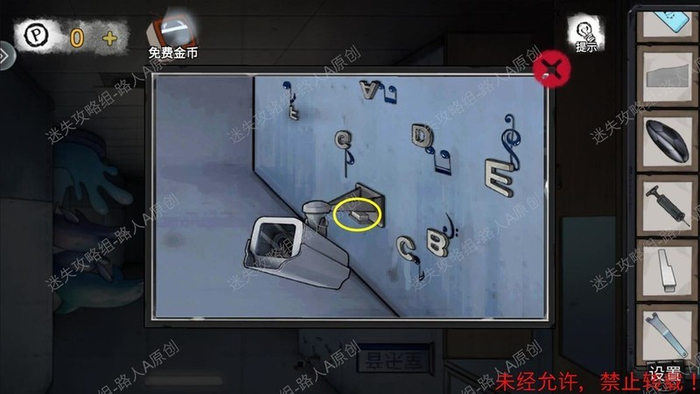 回到二楼走廊,视角翻转至天花板,点击摄像头取得,留意字母与音符的线索提示。