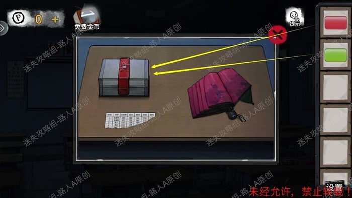 点击课桌,将两个按钮放入盒子的凹槽中,完成小游戏后即可获得钥匙。