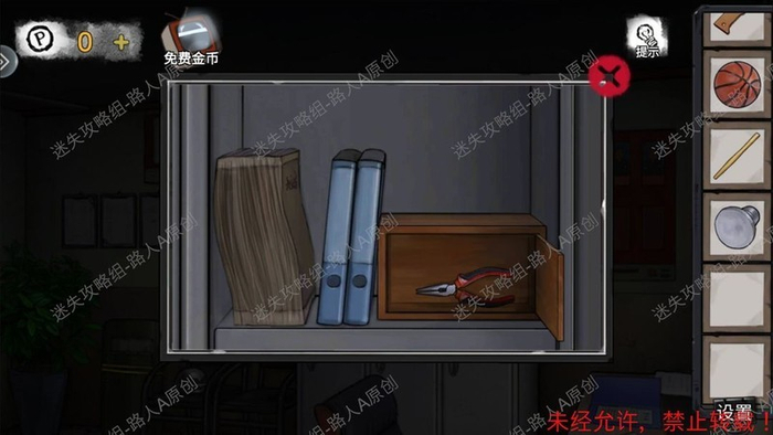 回到门卫室,打开柜子将两块残缺嵌块放入凹槽,成功取得尖嘴钳。