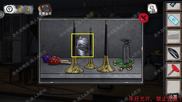 返回医务室,视角翻转至天花板,点击帘子获取琴键。