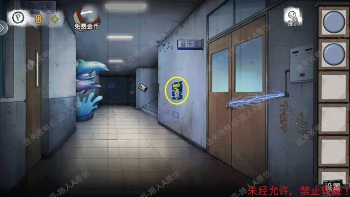点击右侧墙面的电箱,获取圆形部件;再点左侧门处,拾取玻璃海豚。