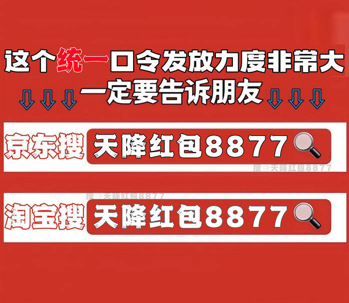 划重点!今年天猫/淘宝和京东最新的双十一统一红包口令都是「天降红包8877」一定要记住!领的红包大小和你搜索的什么口令有关的!“天降红包8877”这个双平台唯一红包口令包领到大的!记得每天去领!