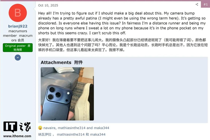 10 月 18 日消息,科技媒体 GSMArena 今天(10 月 18 日)发布博文,称部分苹果 iPhone 17 Pro 及 iPhone 17 Pro Max 的首批用户反映,其设备遭遇了机身褪色问题,主要集中在“星宇橙”和“深蓝色”两种配色上。