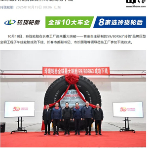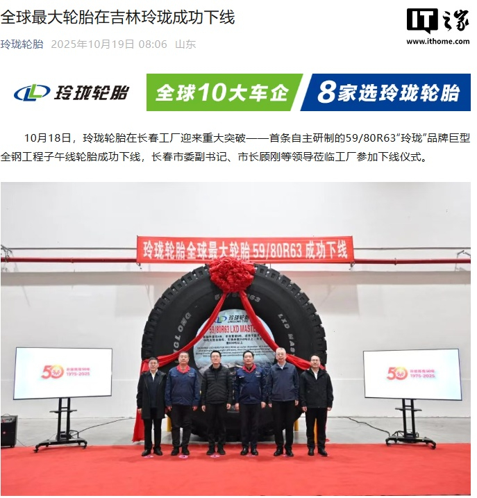 IT之家 10 月 19 日消息,10 月 18 日,玲珑轮胎在长春工厂迎来重大突破 —— 首条自主研制的 59/80R63“玲珑”品牌巨型全钢工程子午线轮胎成功下线。