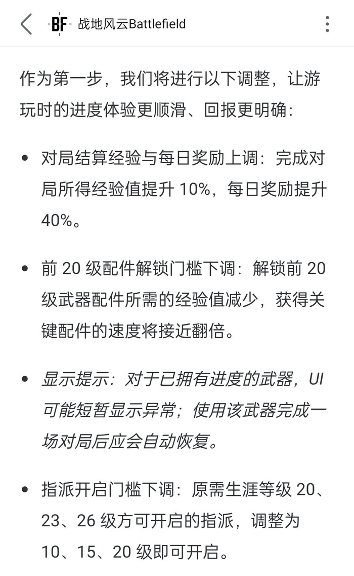 虽说这次《战地6》官方有意树立最基本的“听劝”人设,自内测阶段就经常根据社区反馈对游戏做出修复和调整。官方在我写这篇夜谈的时候实装了初步改进,上调帐户和枪械的经验值获取效率,并承诺会在将来优化任务的挑战条件。