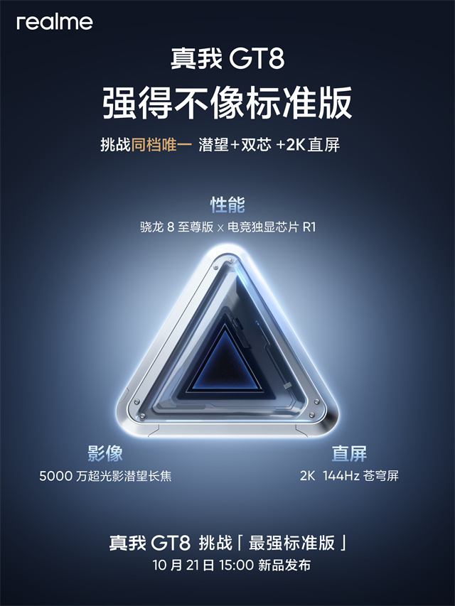 而真我GT8目前透露出的信息来看,同样搭载理光GR影像系统,更是同档中唯一拥有2K 144Hz苍穹屏、骁龙8至尊版+电竞独显芯片R1满血调校旗舰双芯以及5000万像素潜望长焦的超强标准版,设计上也有着旗舰同款的AG玻璃、类纸再生皮革,续航充电搭载7000mAh+100W,可以说是目前市场上极具竞争力的最强标准版之一,具体真我GT8系列还能带来哪些配置惊喜,系统和具体的产品表现又将如何,尤其是备受瞩目的售价方面会不会带给更多人惊喜,不妨等待10月21日15:00发布会上为我们一一揭晓真我GT8系列的产品魅力。