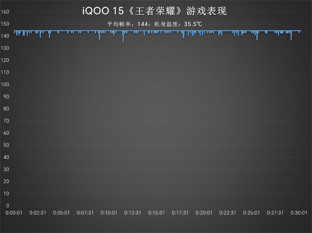 《王者荣耀》144帧+极致画质,半小时平均帧率为144帧,机身温度为35.5℃;《崩坏:星穹铁道》2K+90帧,半小时平均帧率为90帧,机身温度38.4℃。就上述两款游戏来看,iQOO 15可以说在流畅度、清晰度和温控等方面都实现了很大幅度的提升。