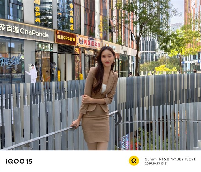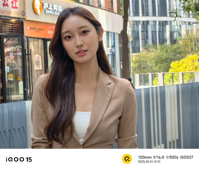 iQOO 15在人像表现提升也比较大,首先它充分发挥了三颗镜头的高解析力优势,推出高像素人像模式,目前已经覆盖到了23mm到100mm等五个常用焦段,可以看出清晰照片中保留了小姐姐的五官、头发、衣着等元素,达到了写真级别。