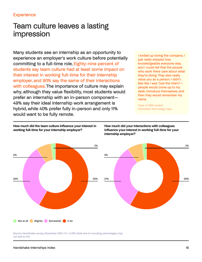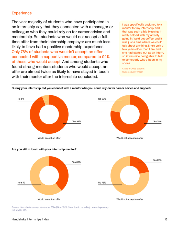 对于希望在人才争夺战中胜出的雇主而言,提供有意义的实习体验是关键。研究发现,薪酬的公平性显著影响实习生的留任意愿。在感觉薪酬公平的实习生中,有82%愿意接受全职工作邀请,而感觉薪酬不公的群体中,这一比例降至63%。此外,超过九成的学生表示,高质量的导师指导对他们是否考虑长期为该雇主工作产生了影响,这证明了 mentorship 在塑造实习体验和吸引人才方面的重要作用。