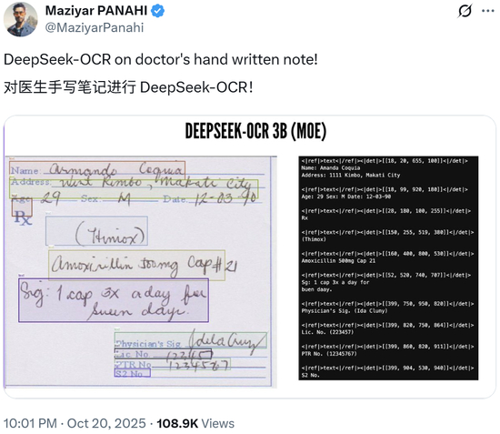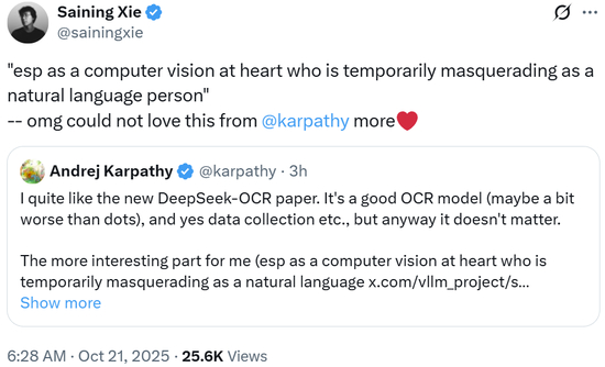 因为是开源的小模型,DeepSeek-OCR 第一时间经历了整个 AI 社区的检验,很多大佬在看完论文之后纷纷发表了看法,兴奋之情溢于言表。