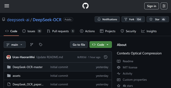 GitHub 上,DeepSeek-OCR 项目一晚收获了超过 4000 个 Star。
