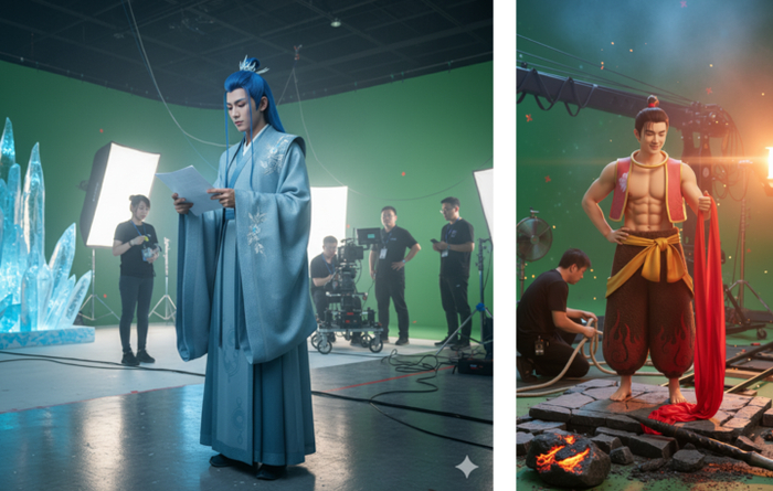 继续同样的流程,我们可以得到敖丙、哪吒的真人幕后图片和视频。把他们剪辑在一起,就可以以假乱真地说,「哪吒真人版电影选角定了,片场幕后视频曝光。」