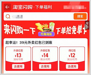 首次输入淘宝闪购外卖红包官方领取口令后,下次领取只需要再次打开手机淘宝APP,点击顶部导航“闪购外卖”后,在点击搜索框找到历史搜索记录中的外卖红包领取口令“福气红包39555”,点击即可进入领取当天可用的淘宝闪购外卖红包。