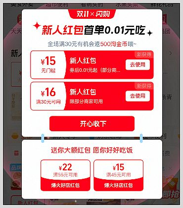 淘宝闪购外卖红包天天领入口,每天淘宝闪购点外卖前领取淘宝闪购外卖红包(当天有效)新人可获得15元无门槛外卖红包,非新用户天天可领取满15减14、15减13、15减12、满15减11、满15减10等以官方实际领取结果为准。淘宝闪购点外卖下单时使用可享受优惠。
