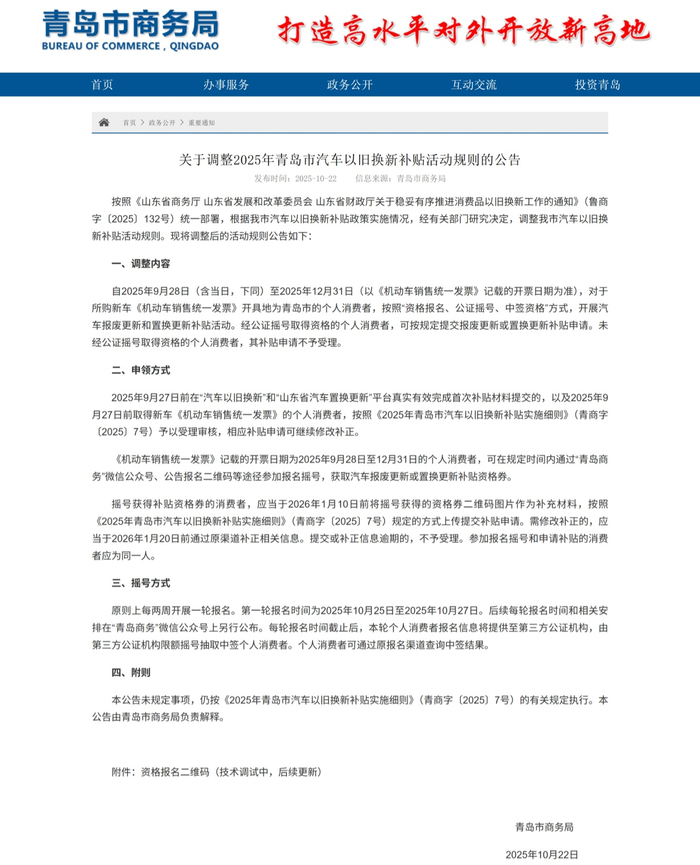 IT之家 10 月 22 日消息,青岛市商务局今日发布“关于调整 2025 年青岛市汽车以旧换新补贴活动规则的公告”,宣布对于所购新车《机动车销售统一发票》开具地为青岛市的个人消费者,按照“资格报名、公证摇号、中签资格”方式,开展汽车报废更新和置换更新补贴活动。