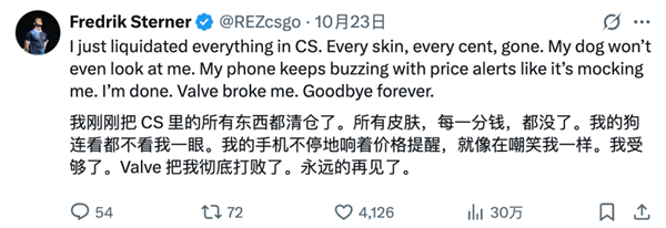 CS 更新的影响有多大呢?科创板日报称,CS 游戏饰品市场估值从59亿美元暴跌至42亿美元,一日蒸发近20亿美元。