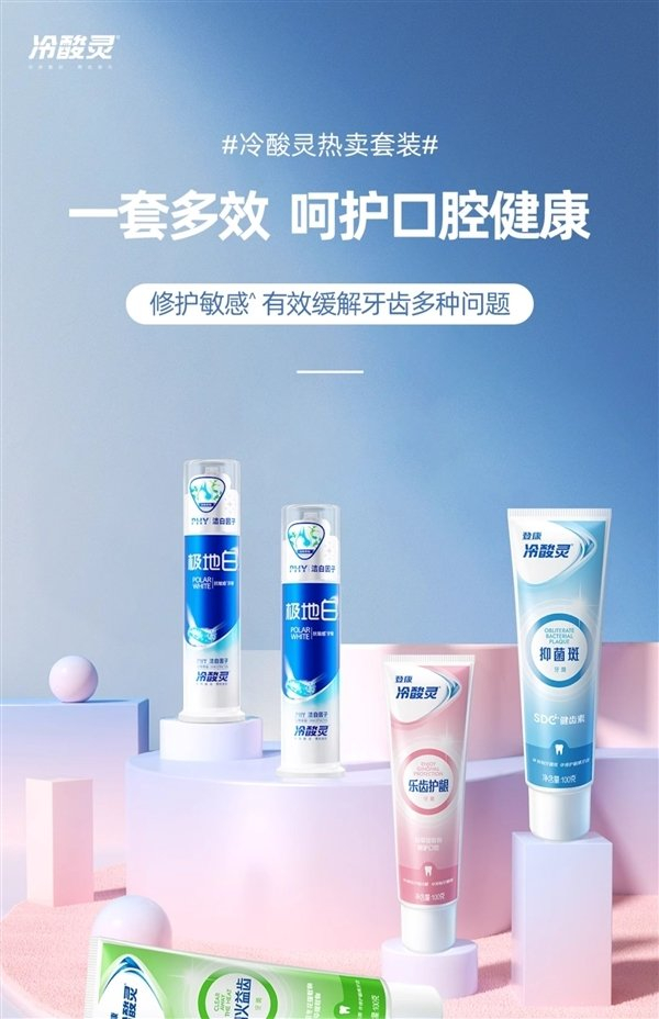 产品包括5支牙膏:极地白100*2+乐齿护龈100g*1+抑牙菌斑100g*1+清火益齿100g*1,