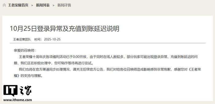 IT之家 10 月 25 日消息,《王者荣耀》官方今日发布《10 月 25 日登录异常及充值到账延迟说明》,称王者荣耀十周年庆各项福利活动已于 0:00 开放,由于同时在线人数较多,部分玩家可能出现登录异常、充值到账延迟的问题。