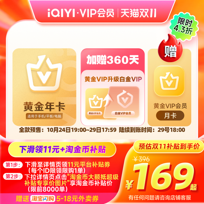 爱奇艺白金会员(支持电视)日常价 388 元 / 年,今日十一大促仅需 168 元破冰新低 + 赠 35 天黄金会员(价值 20 元)。
