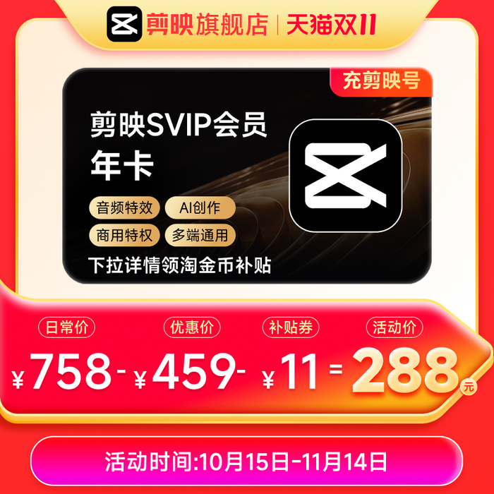 日常 298 元,今日官方 11.11 大促 14 月卡仅需 189 元。