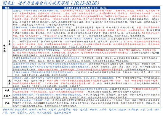近半月,二十届四中全会召开,中美经贸谈判有新进展。我们对每半月重大政策进行跟踪:1)中央、部委重要会议与政策;2)地方政策;3)行业与产业政策。本期为近半月(2025.10.13-10.26)的政策跟踪。