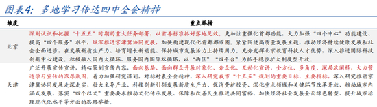 近期北京、上海、浙江等地学习传达四中全会精神,首要是抓好宣传、宣讲、落实,也强调因地制宜。其中,多地强调对标对表、科学谋划本地区“十五五”规划,突出核心任务,如浙江强调“必须牢牢扭住高质量发展建设共同富裕示范区这一核心任务”,北京“纵深推进京津冀协同发展,加快构建现代化首都都市圈”,广东深入实施“百县千镇万村高质量发展工程”等;此外,各地也多部署年内经济工作,坚决完成全年经济社会发展目标,如内蒙古“拿出更大劲头大抓招商、大抓项目、大抓投资”。