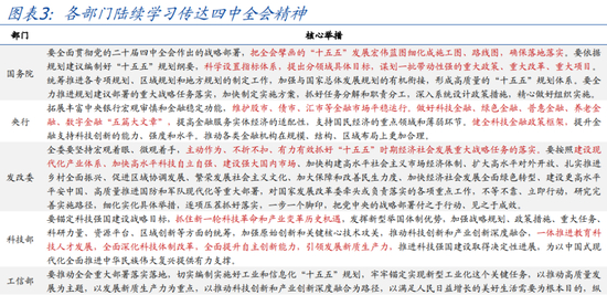 >多部门学习传达四中全会精神,紧扣抓好四中部署、编制好“十五五”规划纲要,有3大关注:1)国务院党组重点抓好“十五五”规划纲要编制工作,“科学设置指标体系,提出分领域具体目标,谋划一批带动性强的重大政策、重大改革、重大项目”;2)央行、证监会均提及资本市场建设,如央行“维护股市、债市、汇市等金融市场平稳运行”,证监会“进一步深化投融资综合改革,持续增强我国资本市场的包容性、适应性和吸引力、竞争力”;3)科技部、工信部均聚焦科技创新、产业融合、新质生产力。