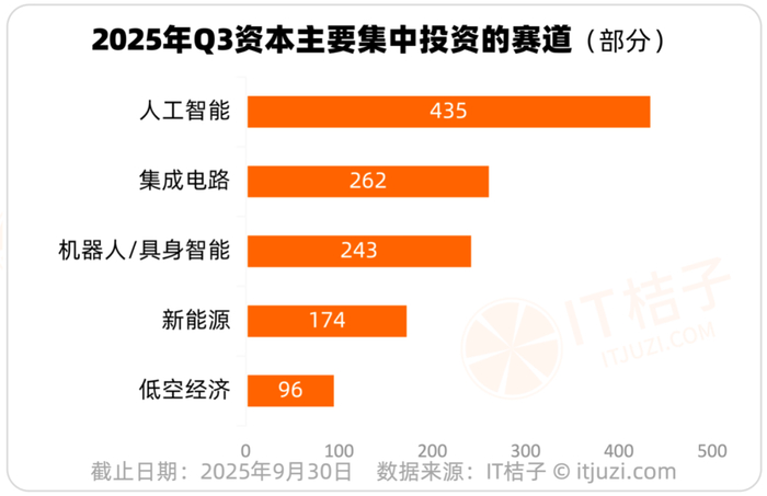 其中人工智能赛道获得435笔融资,集成电路赛道获得262笔融资,机器人/具身智能公司获得243笔融资,新能源赛道获得174笔融资,低空经济赛道也有96笔融资。
