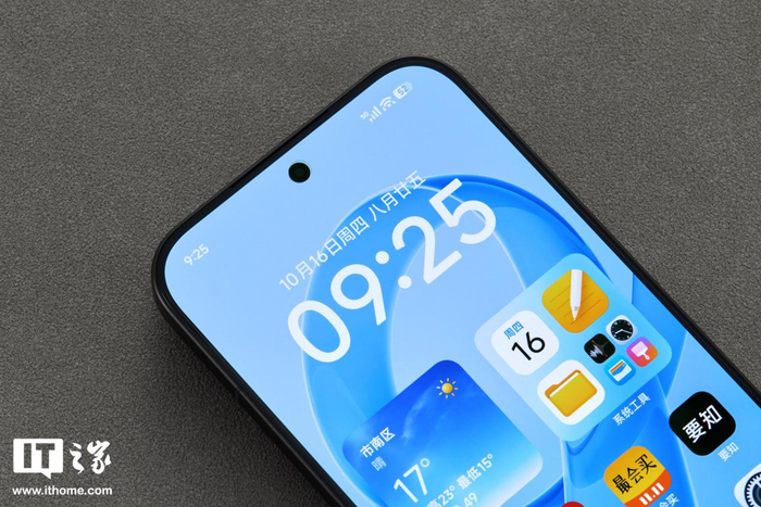 手机正面为一块 6.9 英寸的直屏,上、左、右三边框仅为 1.5mm,下巴宽度为 1.68mm。屏占比很高,亮屏后的视觉冲击力还是比较足的。