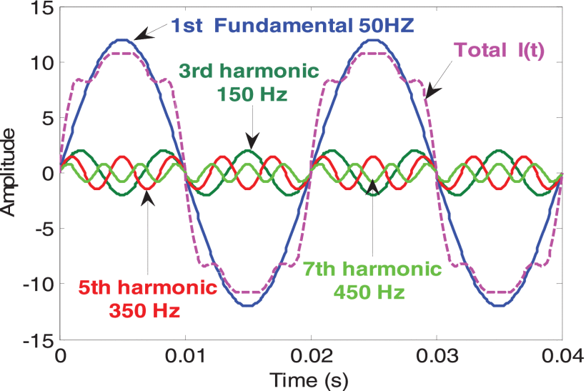 图1通过将失真电流波形I(t)解构为基波分量及其随后的奇谐波来说明这一概念。