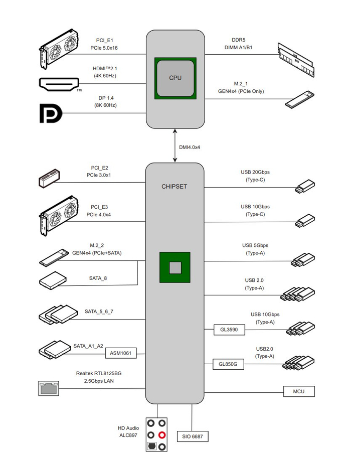 B760MPOWER 采用 mATX 规格、LGA 1700 插槽与 B760 芯片组,兼容第 12 代 Alder Lake、第 13 代 Raptor Lake,以及第 14 代 Raptor Lake-Refresh 处理器。