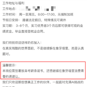 不过,这两个职位介绍中都写着:“本岗位需签署放弃考研承诺书,还想继续在象牙塔里浪费青春的请避让。”