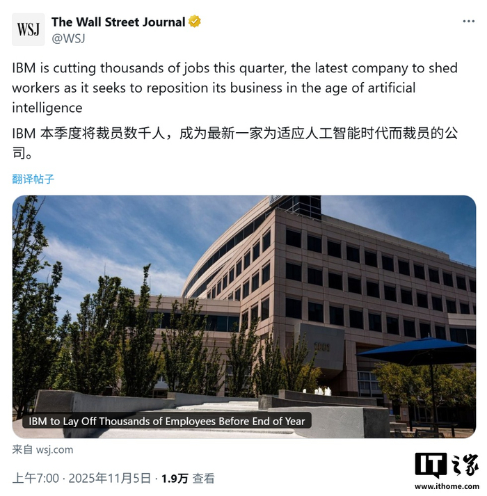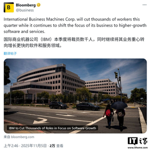 IT之家 11 月 5 日消息,媒体 CNBC 昨日(11 月 4 日)发布博文,报道称 IBM 将在 2025 年第 4 季度进行新一轮裁员,预计波及员工数量,在全球员工总数的占比为“较低的个位数”(low single-digit percentage)。