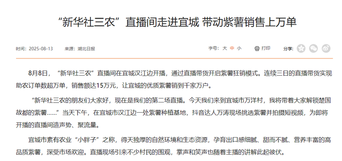 推宜城紫薯时,3天卖出上万单;售利川红茶,9小时卖完682万元库存,相关话题#新华社助农#阅读量轻松破亿。