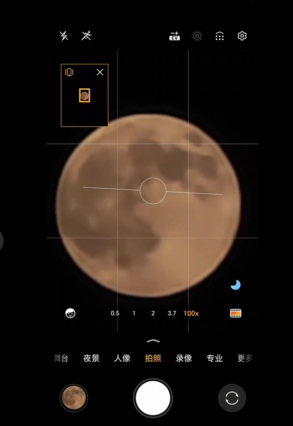 从视频来看,在手持状态下从3.7倍变焦至100倍的过程中几乎没有明显晃动,月亮几乎占满画面,取景也非常轻松。