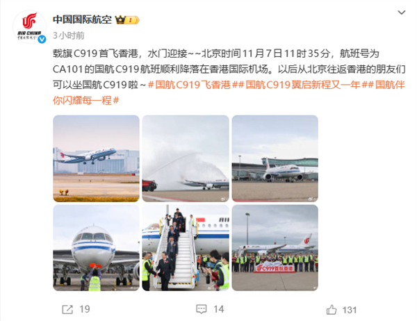 快科技11月7日消息,据中国国际航空官微,今日,航班号为CA101的国航C919航班顺利降落在香港国际机场。