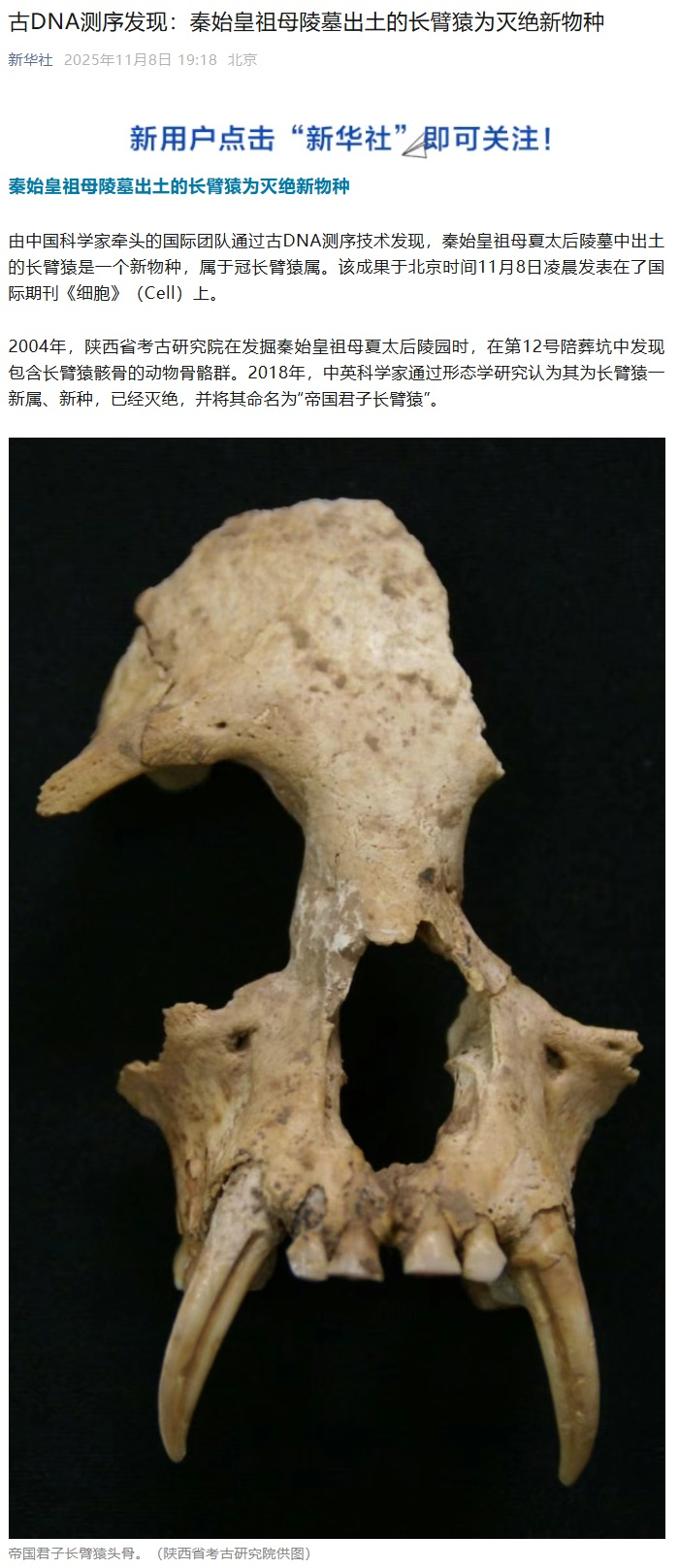 IT之家 11 月 9 日消息,据新华社报道,由中国科学家牵头的国际团队通过古 DNA 测序技术发现,秦始皇祖母夏太后陵墓中出土的长臂猿是一个新物种,属于冠长臂猿属。该成果于北京时间 11 月 8 日凌晨发表在了国际期刊《细胞》(Cell)上。