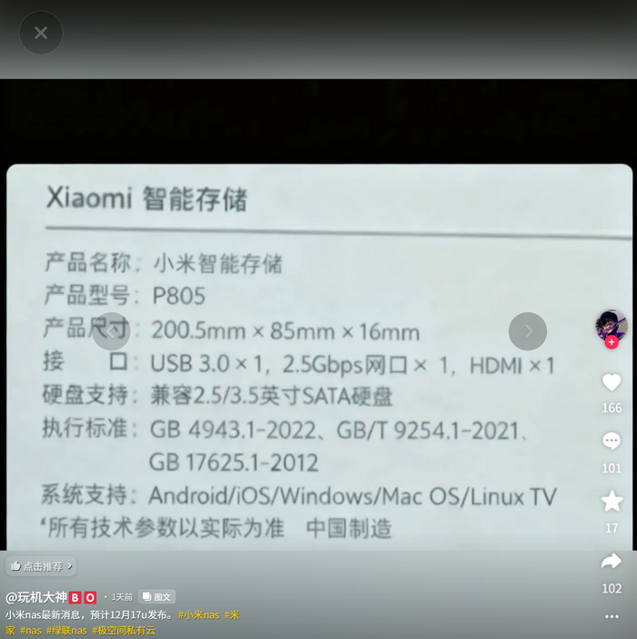 IT之家 11 月 10 日消息,博主 @智慧皮卡丘 今日爆料了小米首款 NAS 家庭存储产品: