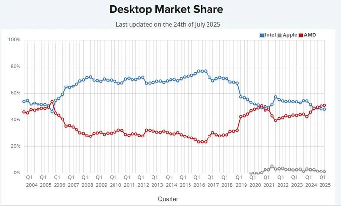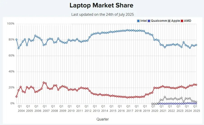 AMD Ryzen 7 9800X3D等CPU受到了游戏玩家和发烧友的一致好评,这主要归功于其3D V-Cache,对高性能CPU(尤其是X3D型号)的需求以及极具竞争力的价格似乎正在削弱英特尔先前的优势。但是,AMD在笔记本CPU领域则表现平平,仅徘徊在22%附近,英特尔仍占据75%的市场份额。