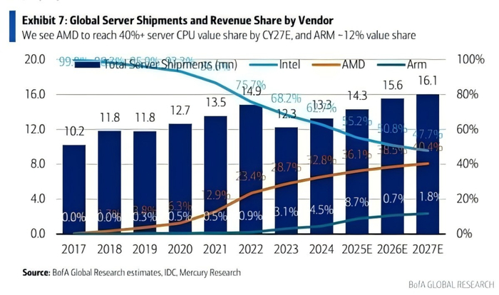 汇总IDC和Mercury Research的调研数据指出,2024年英特尔在服务器处理器市场的份额已降至63%以下,具体为62.7%;同期AMD拥有32.8%的服务器CPU市场份额,且该数据仍处于持续增长态势。预计到2025年底,AMD的市场份额将进一步攀升至36%,致使英特尔份额下降至约55%;展望至2027年,AMD的市场份额可能达到40%,而英特尔预计将跌破50%的关键节点;到2028年,AMD和英特尔的市场份额或呈现旗鼓相当之势。