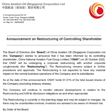 近日,中国航空油料集团旗下在新加坡上市的中国航油(新加坡)股份有限公司发布公告称,中国航油将与另一家企业集团进行重组。《能见派》从消息人士处获悉,重组企业集团为中石化,正就收购中国航油进行谈判。如果交易落地,中国航油将并入中石化。